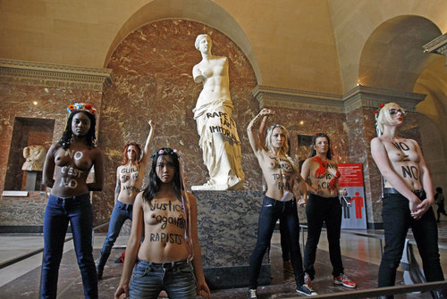 여성에 대한 폭력 없는 사회 그리고 성매매 반대를 위해 몸을 아끼지 않는 과격한 시위로 유명한 피멘(Femen)전사들이 마침내 루브르에도 나타났다.