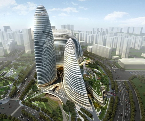 인터뷰에서 하디드는 불법복제 건설사측과 완공 경쟁에 말려들었다고 언급했다. 하디드의 복합단지는 길죽한 세개의 조약돌을 세워놓은 듯한 디자인인데 하늘에서 보면 마치 지구위를 항해하는 요트를 연상시키기도 한다.