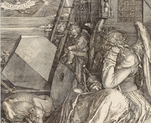 <멜랑콜리아 I>는 서양 미술사에서 가장 불가사의한 작품 중 하나로 여겨지며 많은 연구의 대상이 돼왔다. 멜랑콜리아에서는 해골과 모래 시계 등 수많은 상징물이 등장하는데 이들은 뒤러의 다른 걸작에서도 찾아 볼 수 있다.