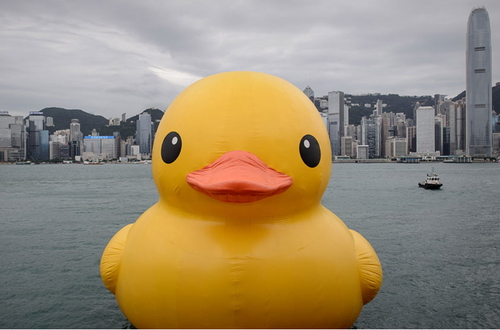 AFP는 지난 2일 홍콩 앞바다에는 6층 건물 높이의 대형 고무오리가 등장해 많은 사람들의 호기심을 자극했다고 전했다. 16.5미터 높이의 이 고무오리는 네덜란드출신 작가 폴로렌틴 호프만의 작품으로 만들어진 것은 지난 2007년이다.