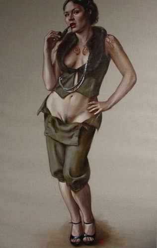 작품은 서있는 여성이 가슴이 깊이 패인 옷에 반쯤 바지를 내린 모습을 그린 것이다.