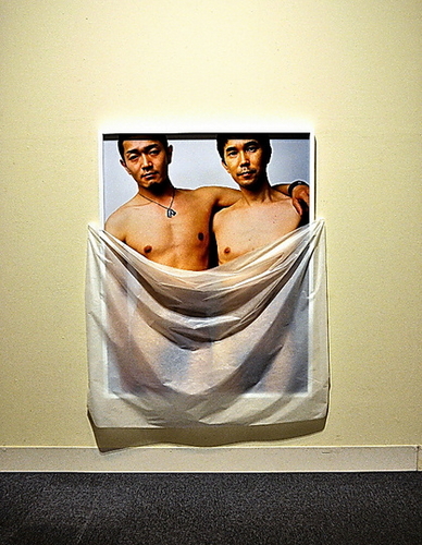 이 전시는 9명의 사진작가와 현대미술작가가 초대돼 사진을 포함한 영상, 설치작업을 선보였는데 천으로 반이 가려진 작품은 사진작가 다카노 료다이(鷹野隆大 51)의 작업으로 그가 모델과 함께 나체를 찍은 사진이다.