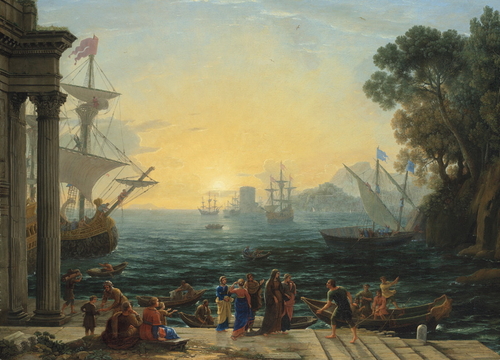 해당 작품은 풍경화의 선구적 화가로 손꼽히는 클로드 로랑이 그린 <예루살렘으로 떠나는 성 폴라가 배에 오르는 지중해 항구>.