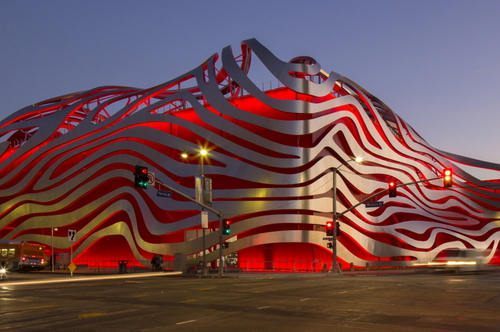 콘 페더슨 폭스사가 작업한 피터슨박물관은 물결 모양의 붉은 조개껍질에 스테인리스 리본을 씌운 듯한 외관이 특징이다.