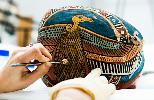이곳에서는 미공개 유물을 포함해 고대 이집트와 누비아 유물 1000여점을 상설 전시하게 된다고.(사진은 BC332-BC30 시대의 프톨레마이오스 왕조때 만들어진 미라 마스크를 손질하는 모습)