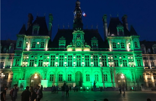 미대통령 트럼프 씨가 파리협약을 탈퇴한다고 선언한지 하루도 안되 파리 시청이 청사 전면을 초록색으로 물들였다.