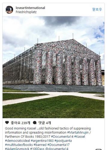 아르헨티나 아티스트 마르타 미누진의 The Parthenon of Books (2017) 등 눈길을 끄는 거대 설치물들