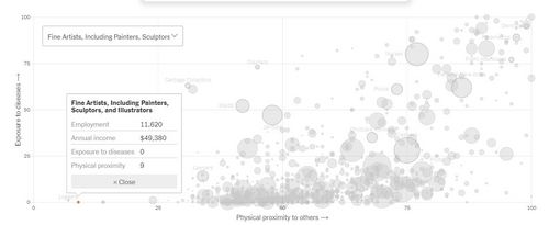 뉴욕타임즈의 데이터 분석에 따르면, 화가, 조각가 및 일러스트레이터 등의 예술가들이 감염 위험이 현저히 낮은 것으로 나타났다. 이 자료는 각 직업 종사자들이 다른 사람들과의 물리적 근접도 및 질병과의 접촉 빈도 두 가지 축으로 만들어진 그래프이다.