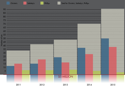 추정가가 5백만 달러 이상이 되는 작품 수가 2011년 이후 꾸준히 증가하고 있음을 그래프를 통해 확인할 수 있다고 아트뉴스가 보도했다.