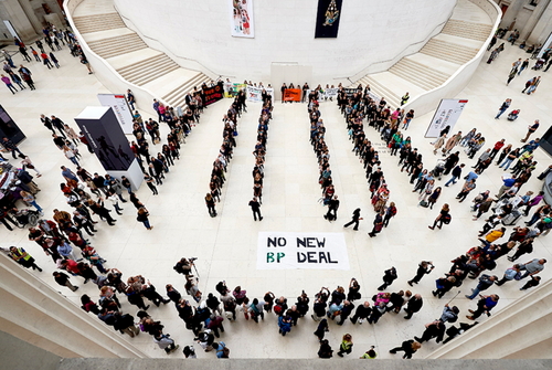 20여명으로 이뤄진 이들 활동가 그룹은 일요일인 3일 대영박물관이 환경오염과 인권침해 의혹이 있는 브리티시 페트롤리움의 지원을 받는 것을 반대하며 박물관내에서 자신들이 순종적 전시라고 부르는 데몬스트레이션을 벌였다.