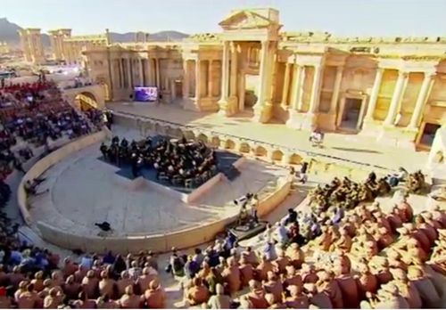 최근 시리아 정부군이 러시아군의 지원 아래 탈환한 팔미라에서 러시아 최고 오케스트라로 손꼽히는 마린스키극장 오케스트라의 깜짝 공연이 5일 오후에 있었다.