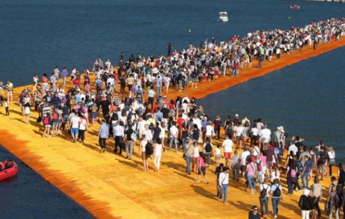 몬테 이솔라 섬은 호수가의 술자노 마을로 나오려면 다리가 없어 배를 탈 수 밖에 없었는데 크리스토가 20만개를 부표를 엮어 3km에 이르는 잔교를 만든 것이다.