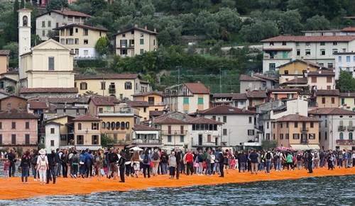 ‘떠있는 잔교’는 밀라노북쪽 이세오 호수가의 솔자노 마을과 몬테 이솔라 섬 사이 3km 거리를 20만개의 부표로 연결해 사람들이 걸어갈 수 있게 한 것.