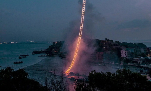 <하늘 사다리>는 지난해 8월 그가 광동성 훼이위섬 항에서 1660개의 다리로 이어진 공중 500미터까지 이어진 사다리가 화약으로 불타오르게 한 작업의 타이틀이기도 하다.